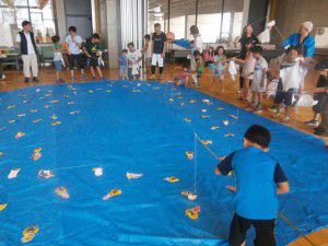 海に見立てたブルーシートに鯨や魚、タコやイカを